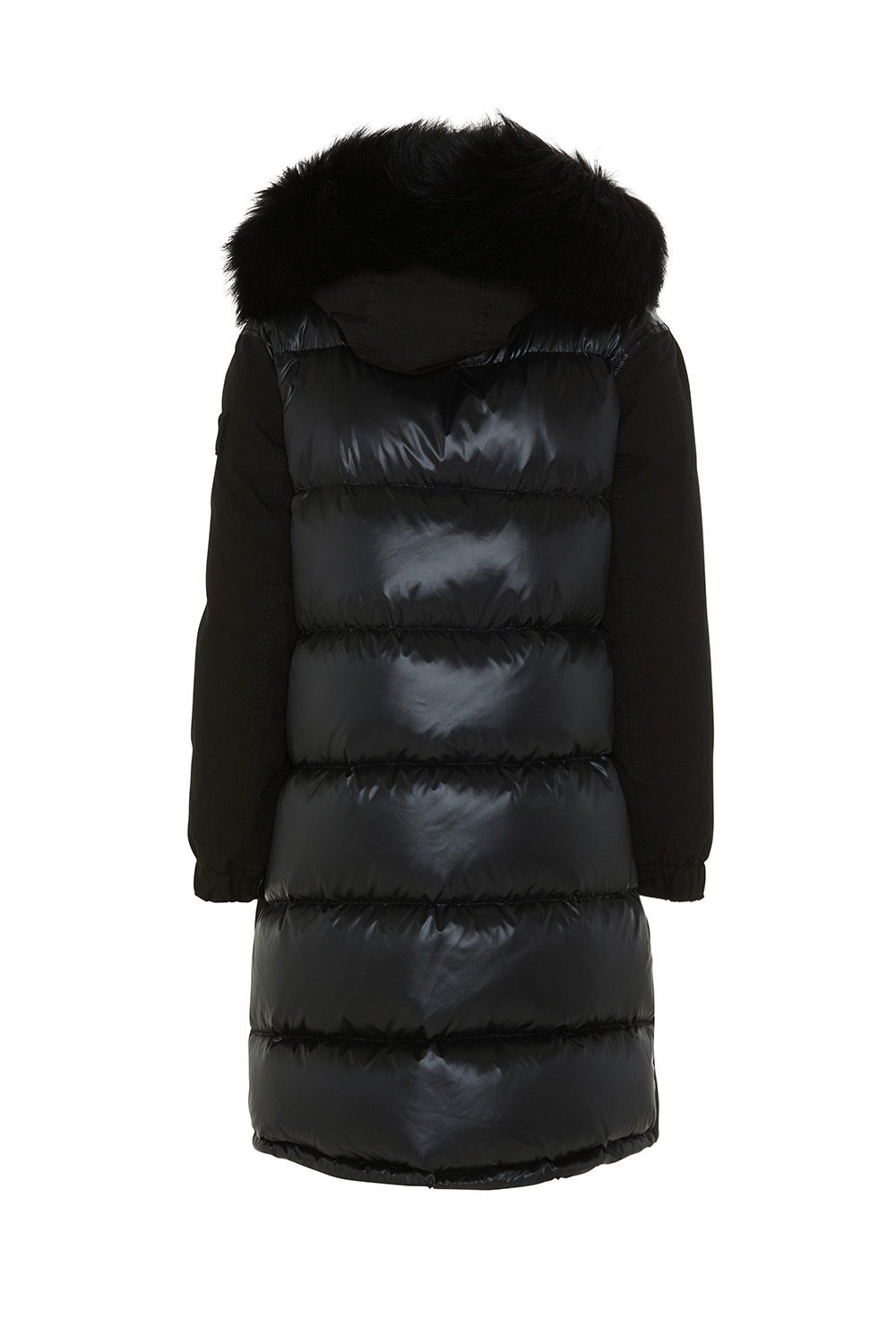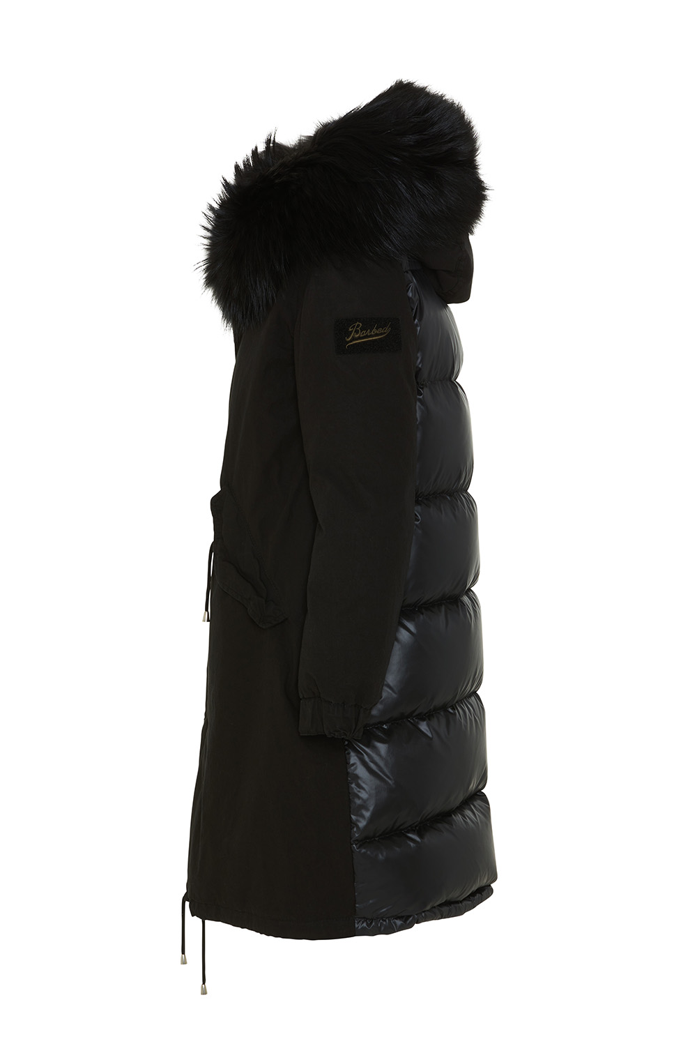 Parka Drake woman long. Shell 100% cotton (front) and 100% PA (back), colour black. Inside front in fox black and inside back in goose black. Hem hood in feenracoon black. Long sleeves with quilted lining inside and button fastening cuffs. 2 flapped front pockets with clip buttons. Drawstring adjustable in hood, waist and bottom. Zipper center front and press studs.