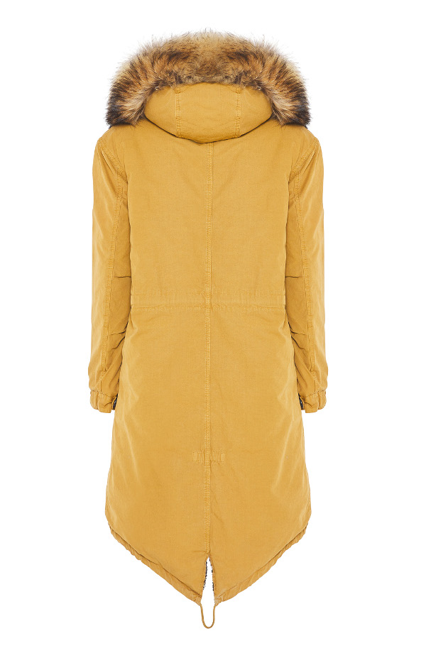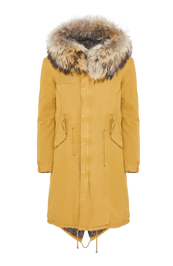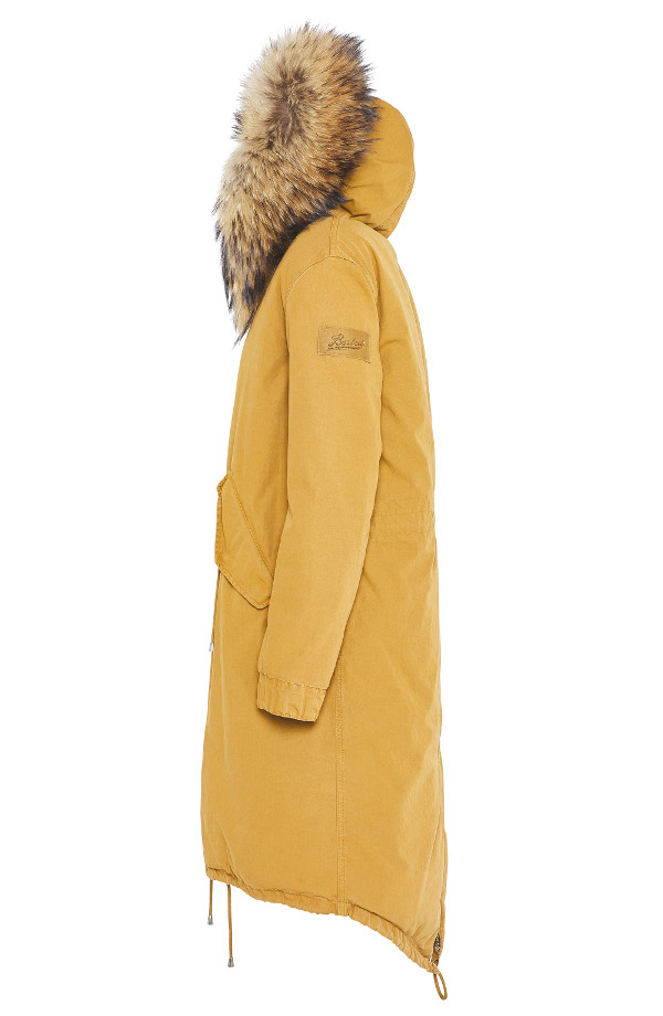 Parka Drake Woman Long. Shell 100% cotton, colour yellow ocher. Wool inside lining. Hem hood in natural feenracoon fur. Long sleeves with quilted lining inside and button fastening cuffs. 2 flapped front pockets with snap buttons. Drawstring adjustable in hood, waist and bottom. Zipper center front and press studs.