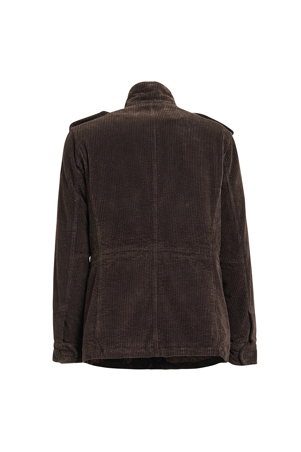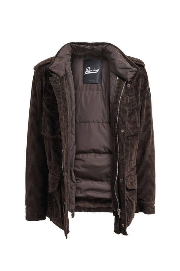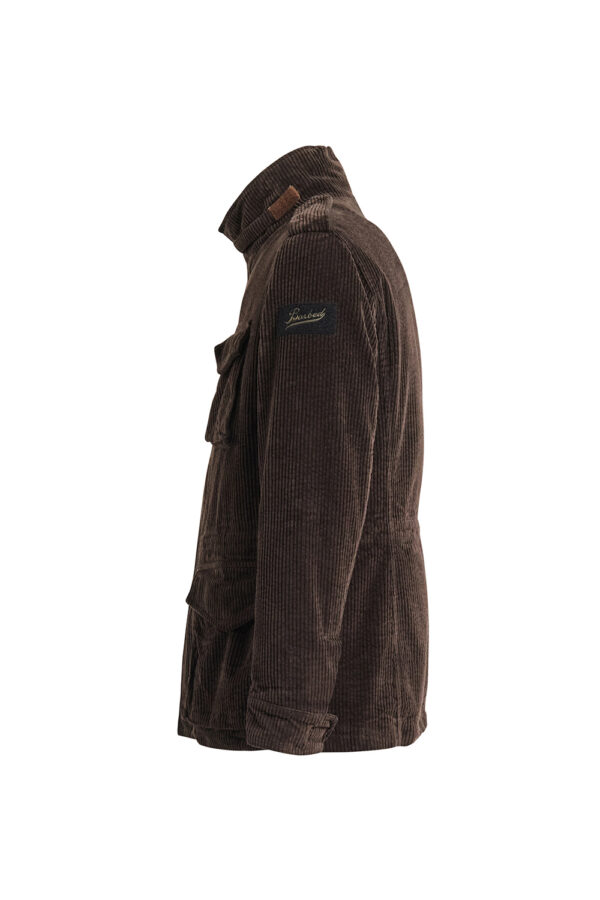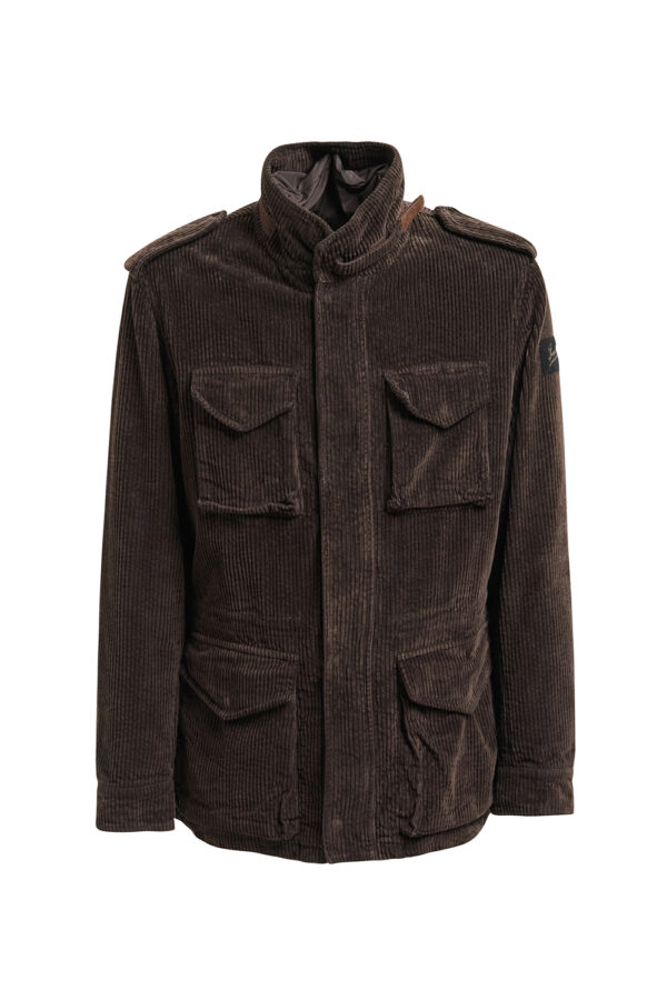 Field Jacket Man. Shell fabric in corduroy (velvet), colour brown. Removable inside lining in goose feather 80/20 class 3 standard europe-70/30 gr with fabric covering in 100% polyester, colour brown and long all goose sleeves. 4 flapped front pockets with snap buttons. Drawstring adjustable in waist. Zipper center front and press studs. Regular fit.