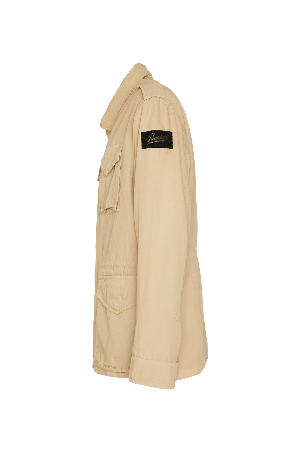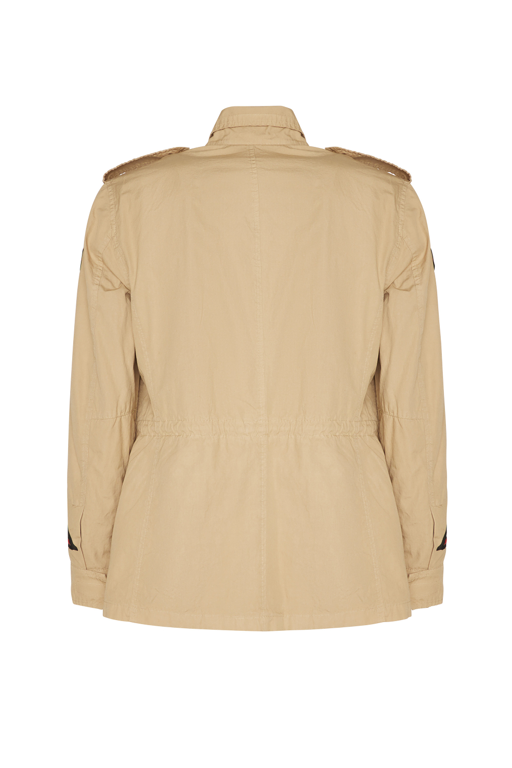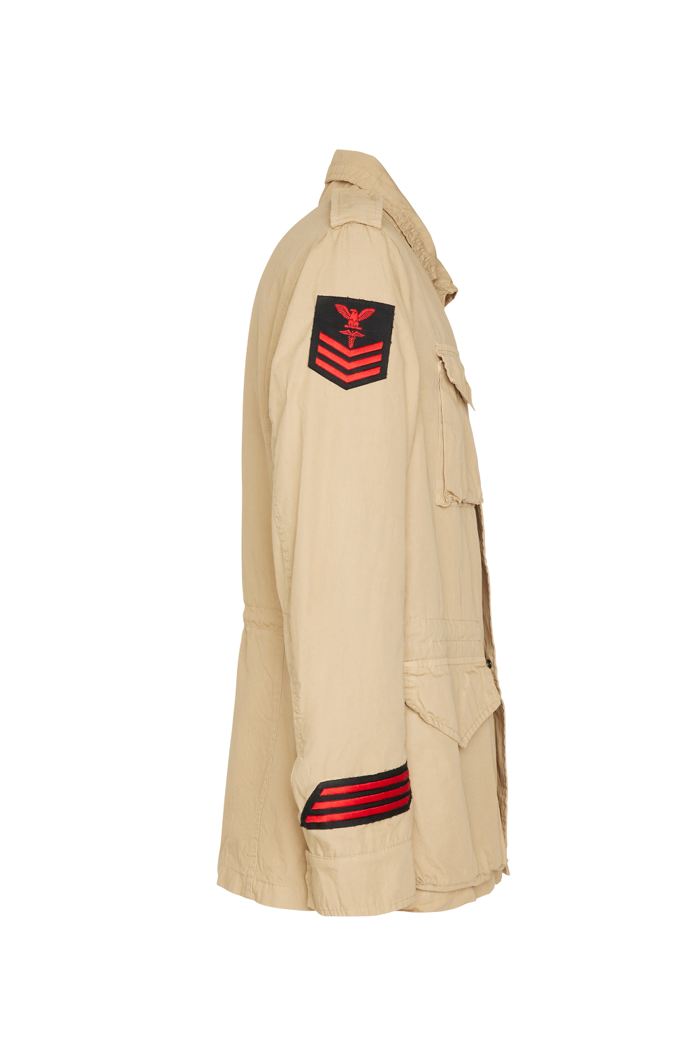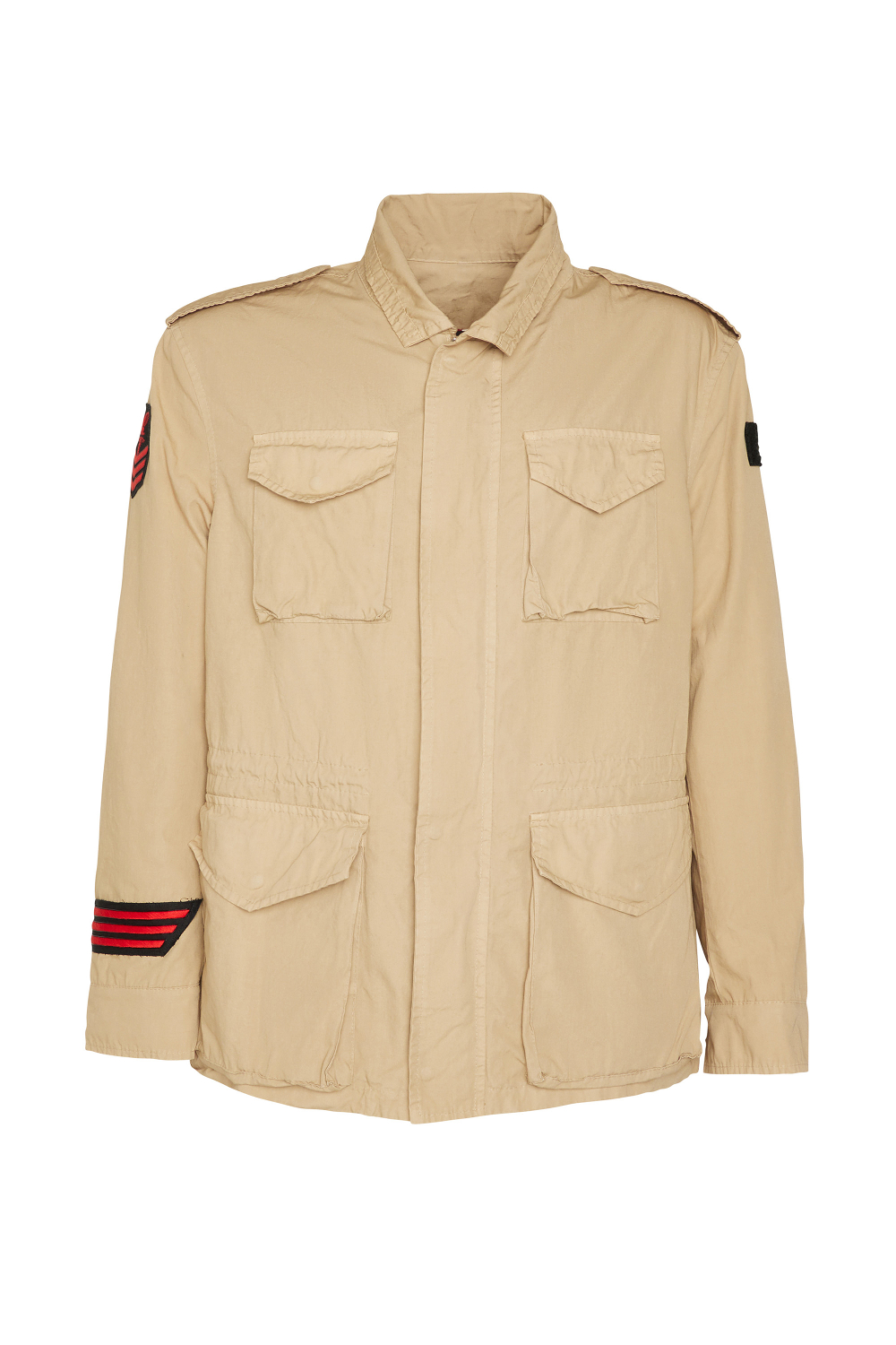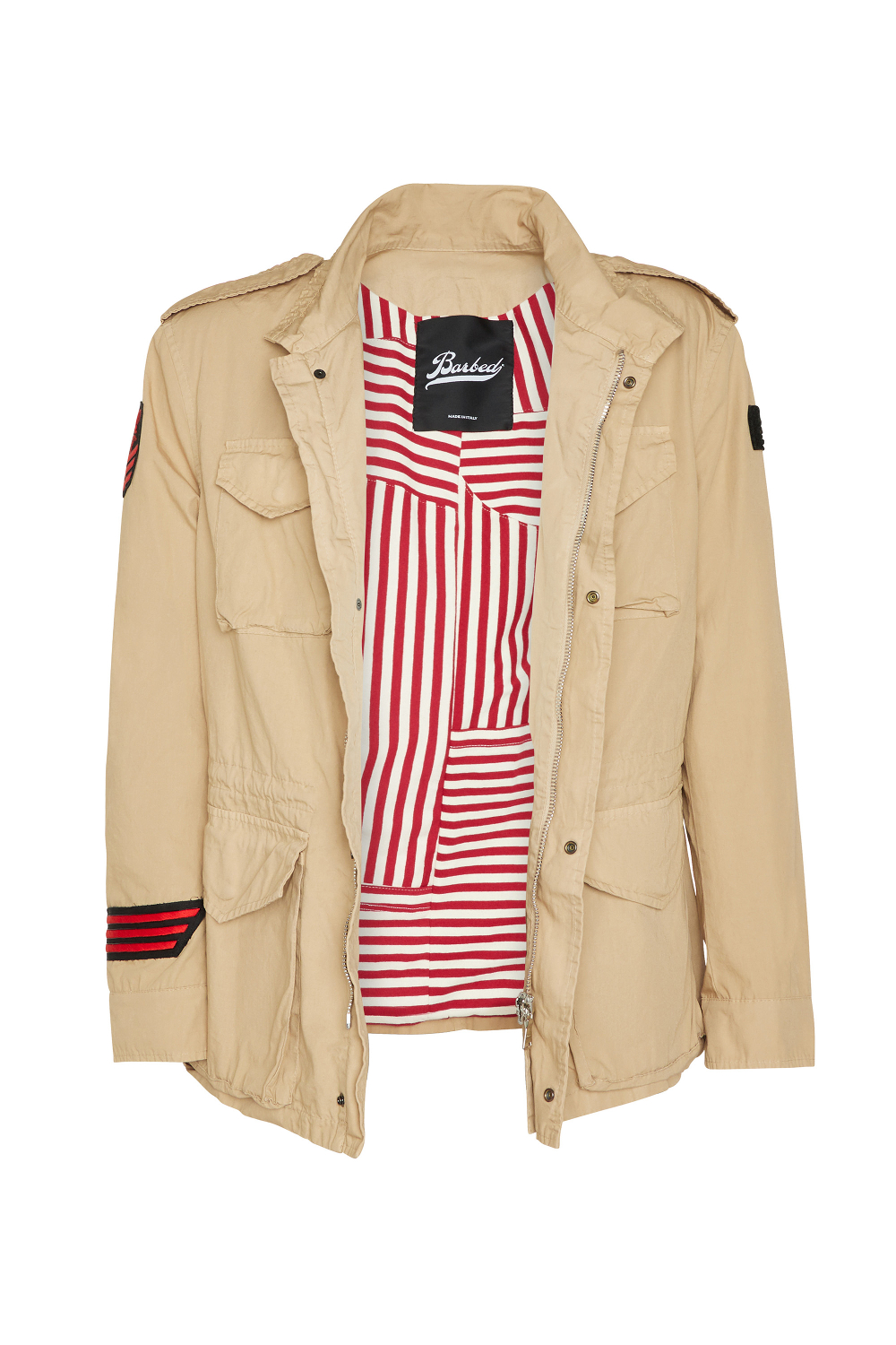 Field Jacket man. Shell fabric 100% cotton, colour walnut. Inside lining made of a patchwork of red striped vintage t-shirts. Eagle patch with levels and navy level patch, colour red on black background, on right sleeve. 4 flapped front pockets with clip buttons. Drawstring adjustable in waist. Zipper center front and press studs. Regular fit.