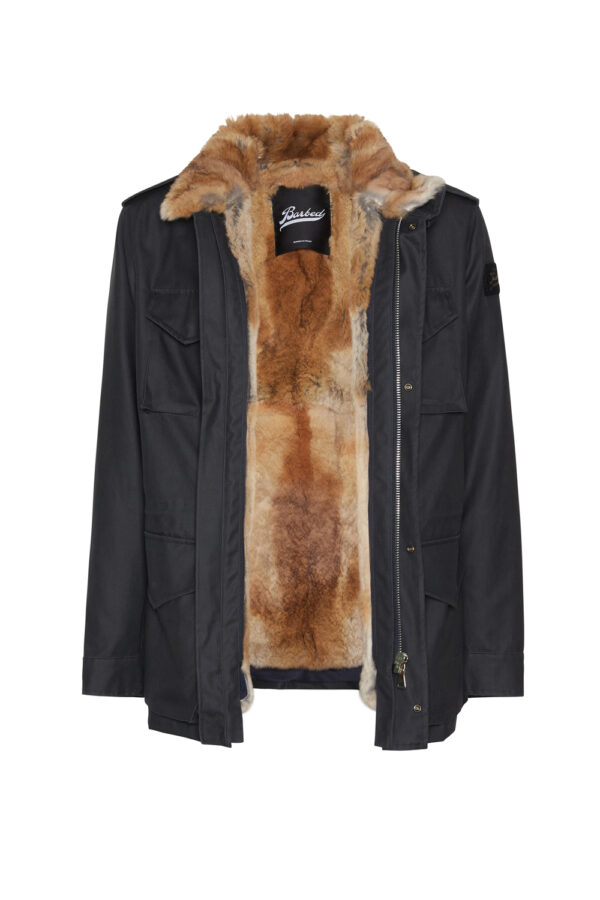 Men’s field jacket. Waxed shell fabric 90% cotton, 10% polyurethane, color blue. Inside shaved rabbit fur. Removable lining. Padded quilted sleeve inside. Four front pockets with flap and snap closure. Drawstring waist. Zip and snap closure.