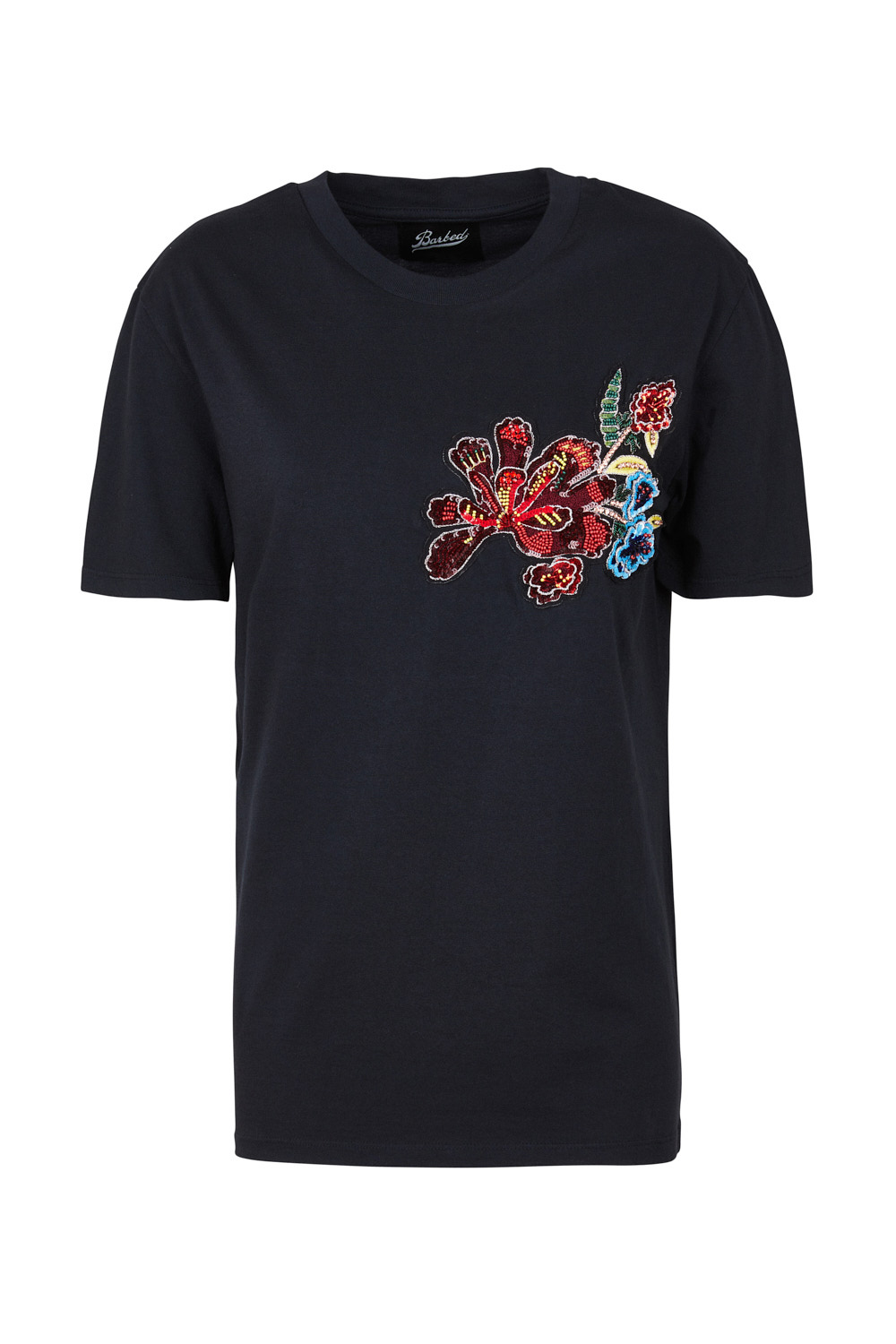T-shirt unisex, with round neck and short sleeves. Fabric 100% cotton, colour black. Red and blue flower patch on the front.