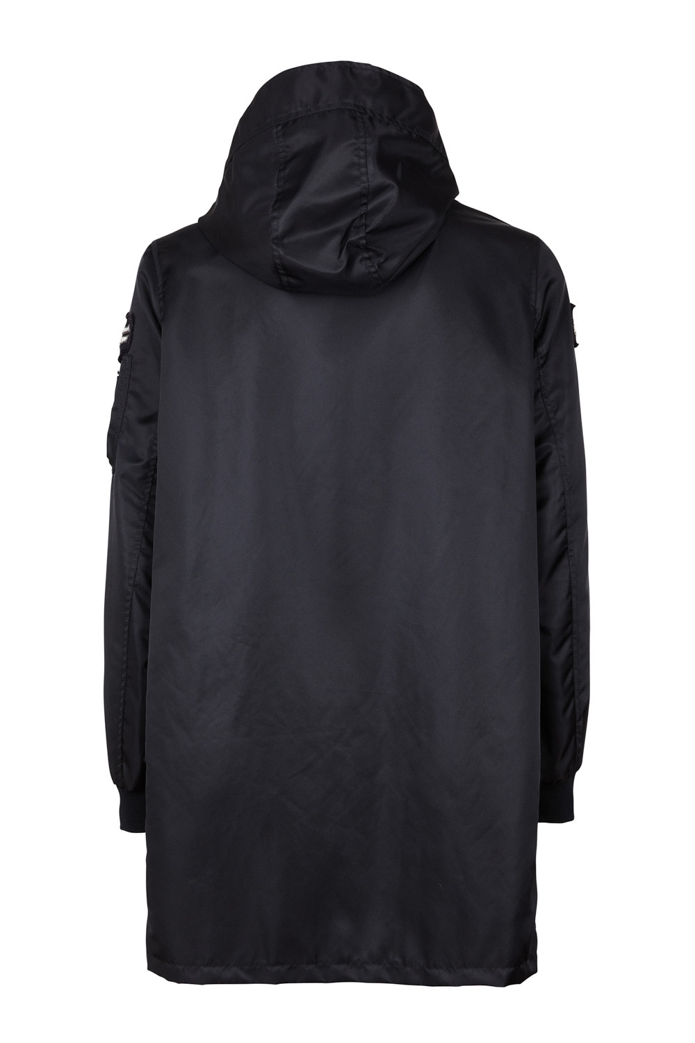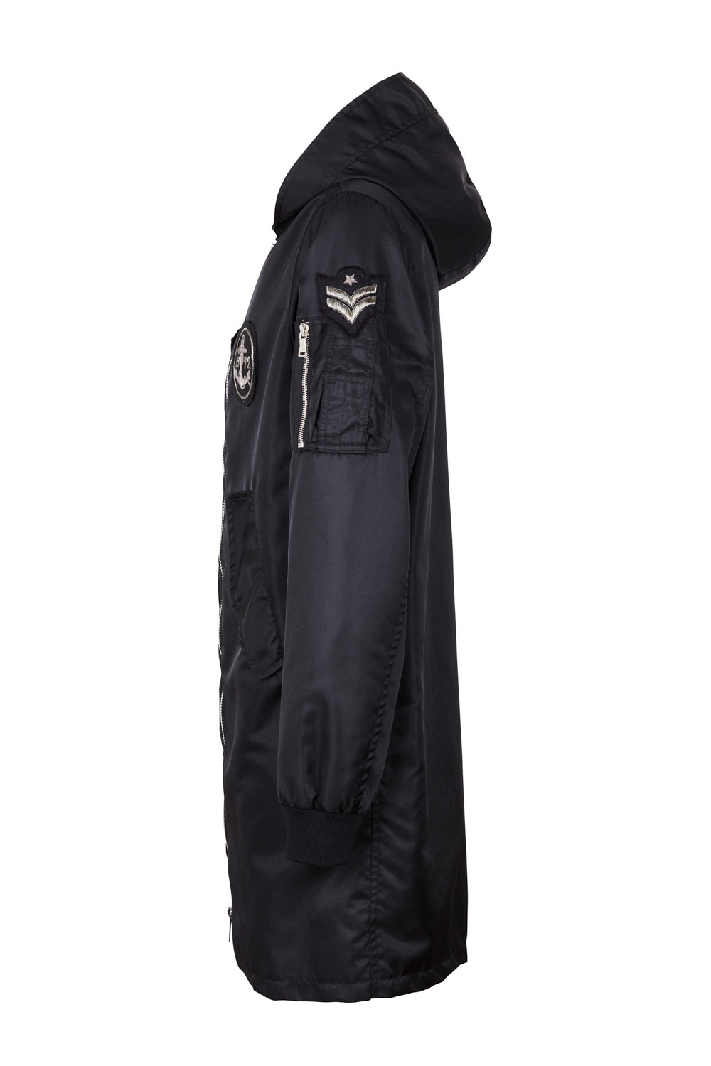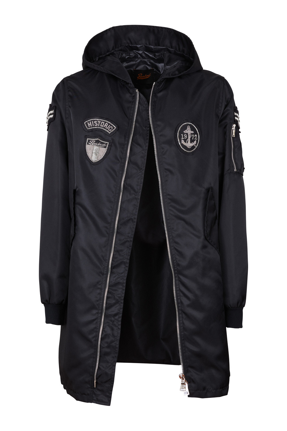 Bomber Lungo con cappuccio. Tessuto 97% poliammide, 3% elastan, colore nero. Patch marina. 2 Tasche frontali con patta,chiusura con bottoni a pressione. Taschino su manica sinistra con chiusura a zip. Maniche lunghe con polsini. Polsini in 90% cotone e 10% lycra Chiusura con zip. Unisex.