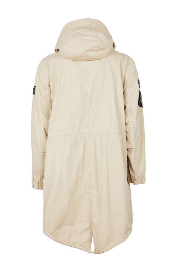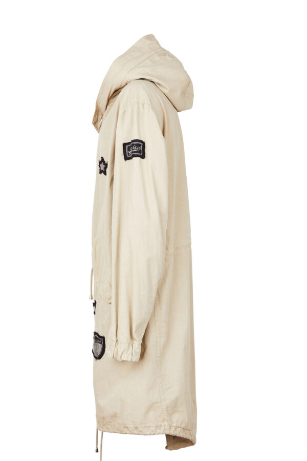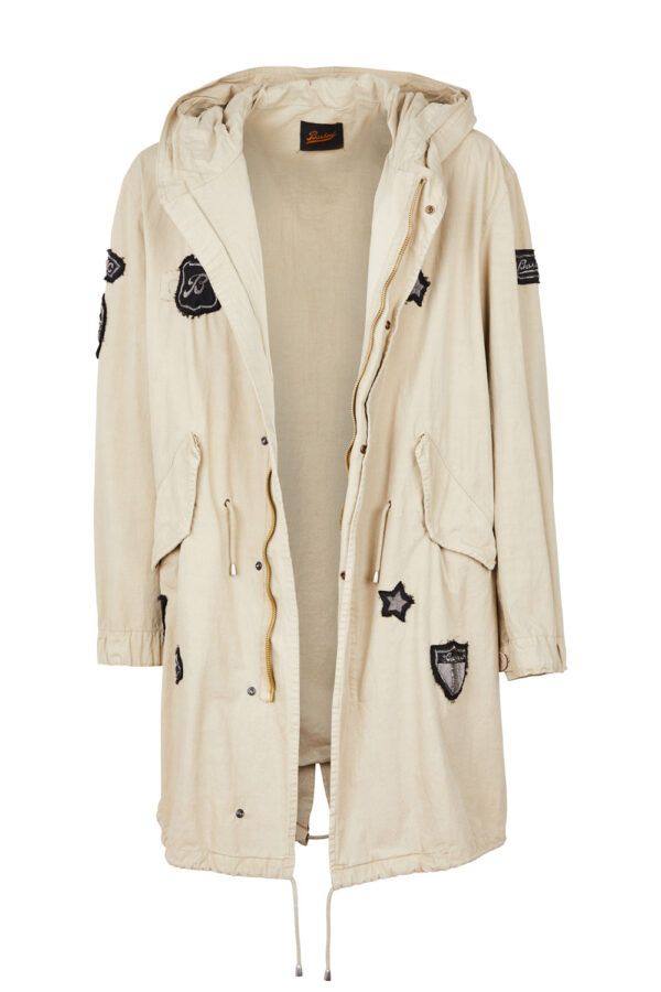 Parka modello Drake uomo lungo. Tessuto guscio 100% cotone, colore sabbia. Interno in 100% cotone mussola, colore sabbia. Multipatch. Due tasche frontali con patta e chiusura con bottoni a pressione. Coulisse in vita, cappuccio e fondo parka. Chiusura capo con zip e bottoni a pressione.