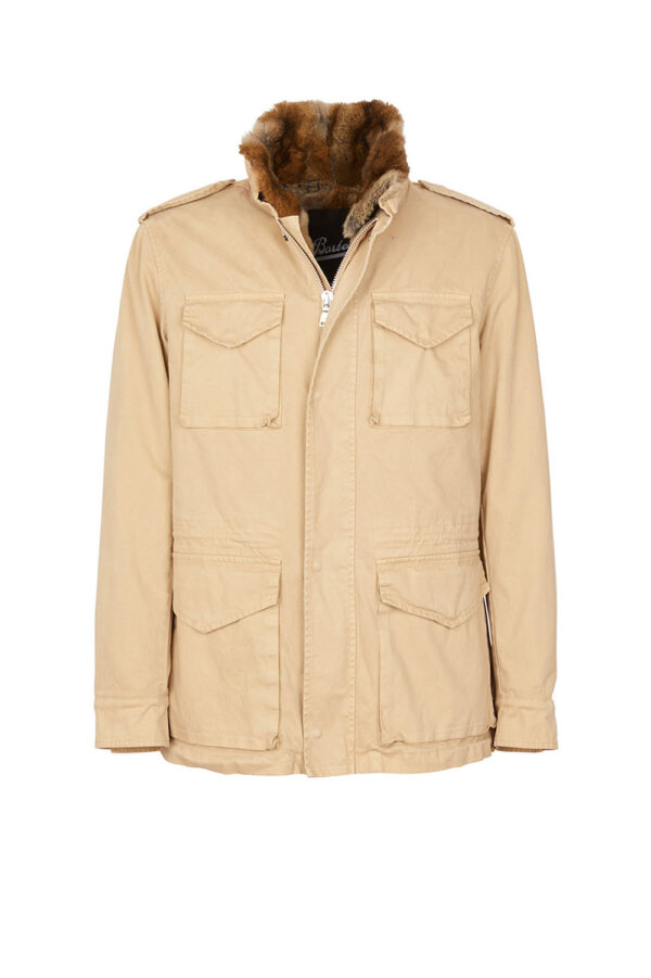 Field Jacket Uomo. Tessuto guscio 97% cotone, 3% elastan, colore noce. Interno pelliccia lapin epilato. Interno estraibile. Manica lunga, interno manica trapunta imbottita. 4 Tasche frontali con patta e chiusura con bottoni a pressione. Coulisse in vita. Chiusura capo con zip e bottoni a pressione.