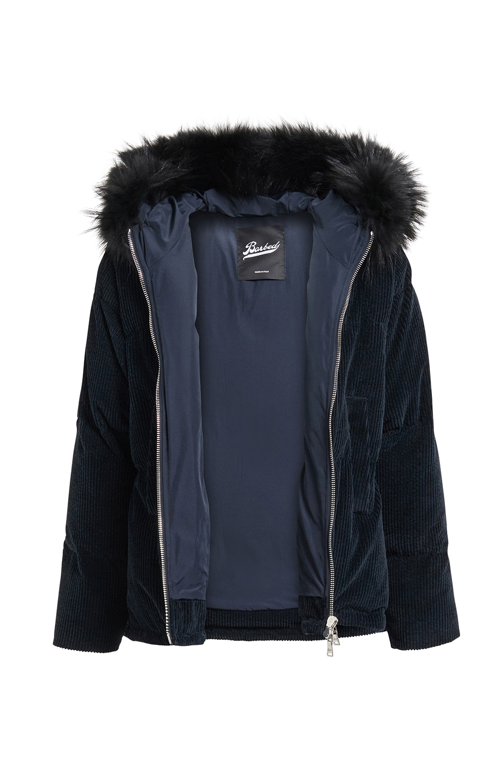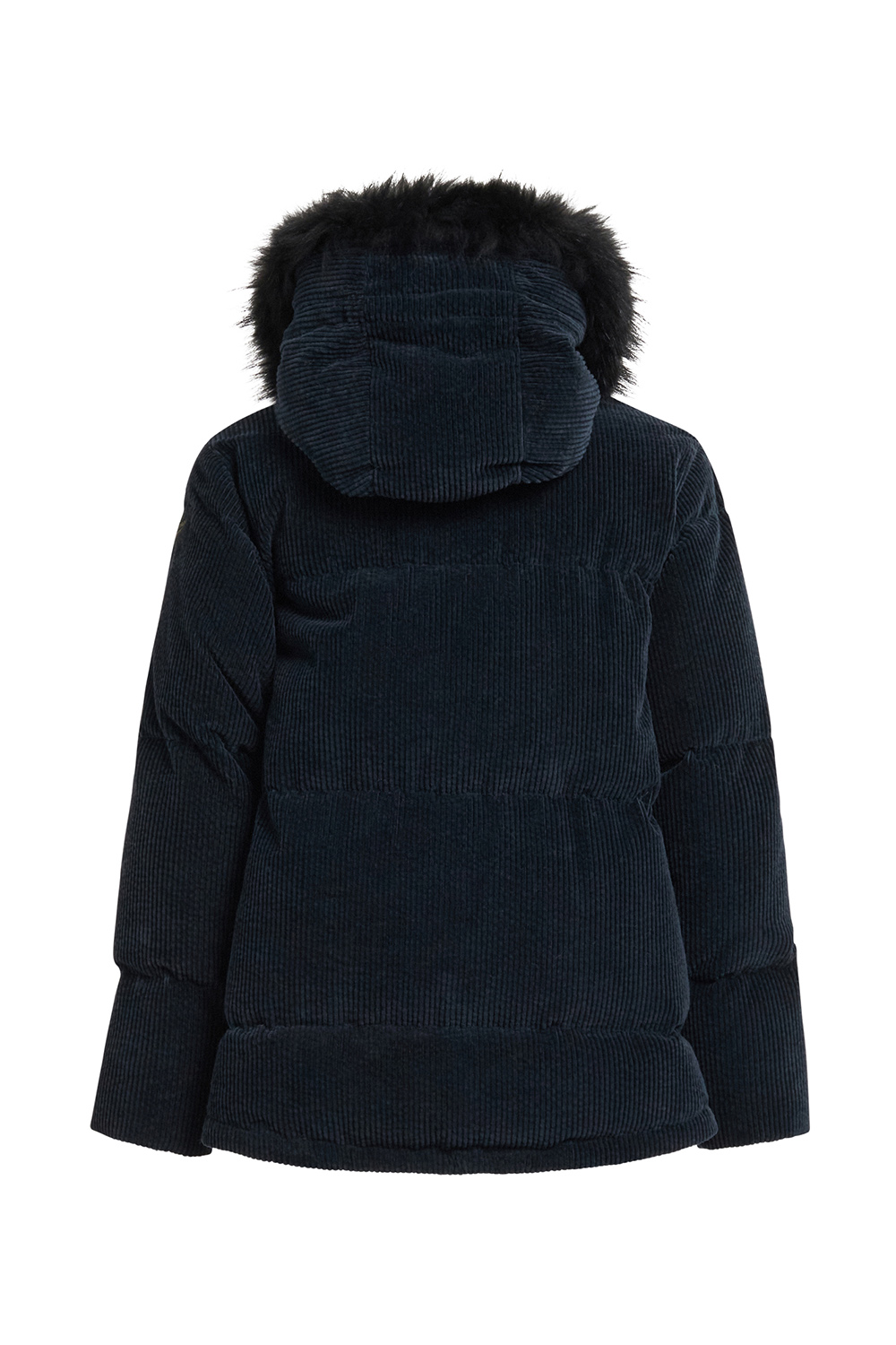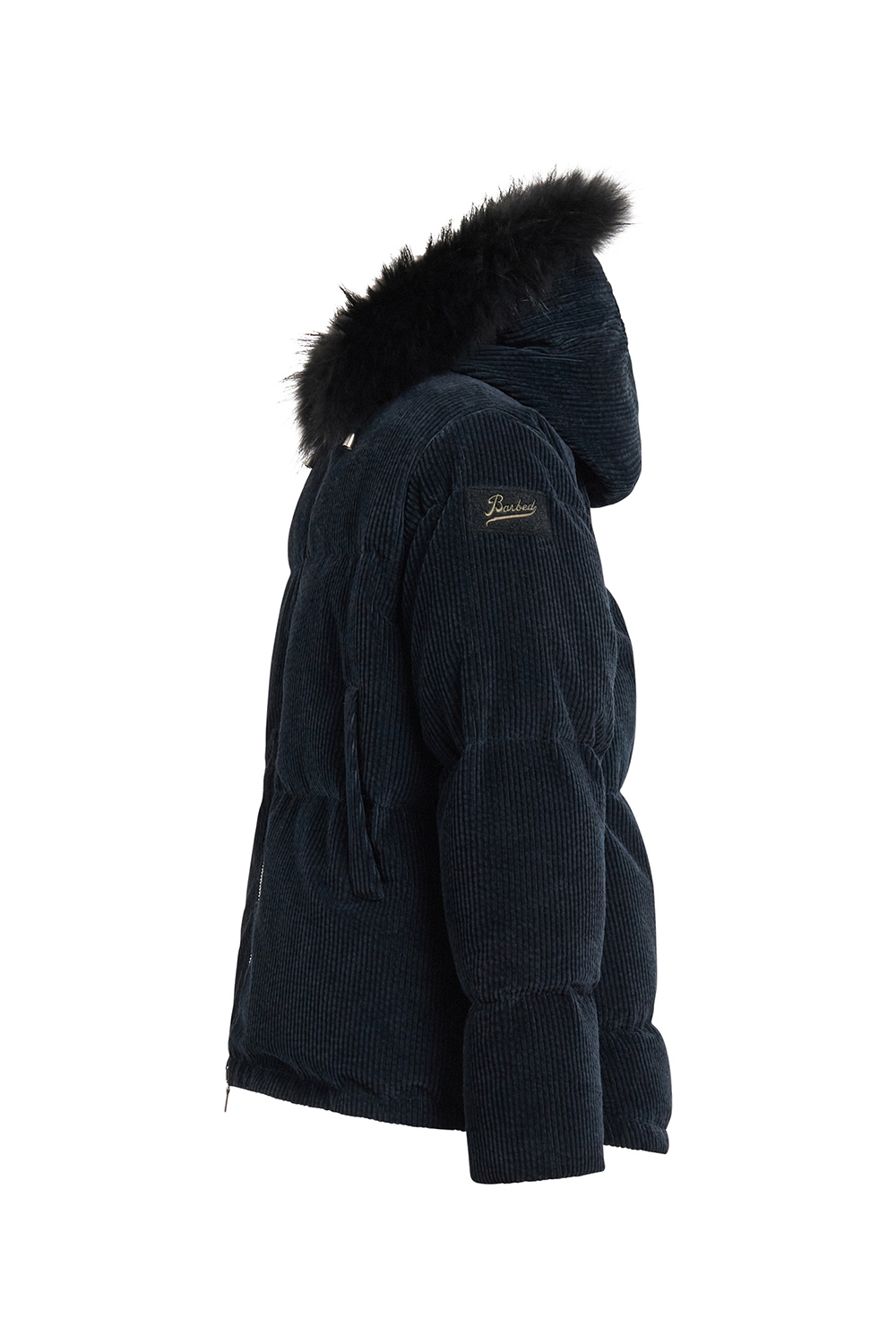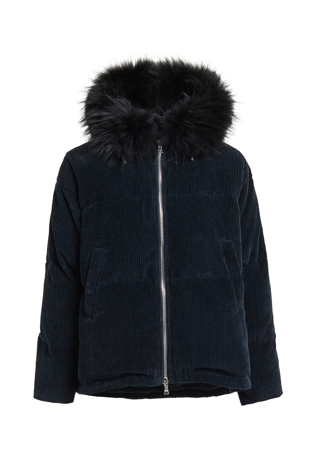 OM1 donna corto. Tessuto guscio in velluto a cote, colore blu. Interno interamente in piuma d’oca 80/20 classe 3 standard europeo – 150 gr, con rivestimento 100% poliestere, colore blu. Bordo cappuccio removibile in finn racoon nero. Manica lunga interamente in piuma, con costina ai polsini. 2 tasche frontali e cordino regolabile al cappuccio e fondo. Chiusura capo con zip centrale a doppio cursore. Vestibilità regolare.