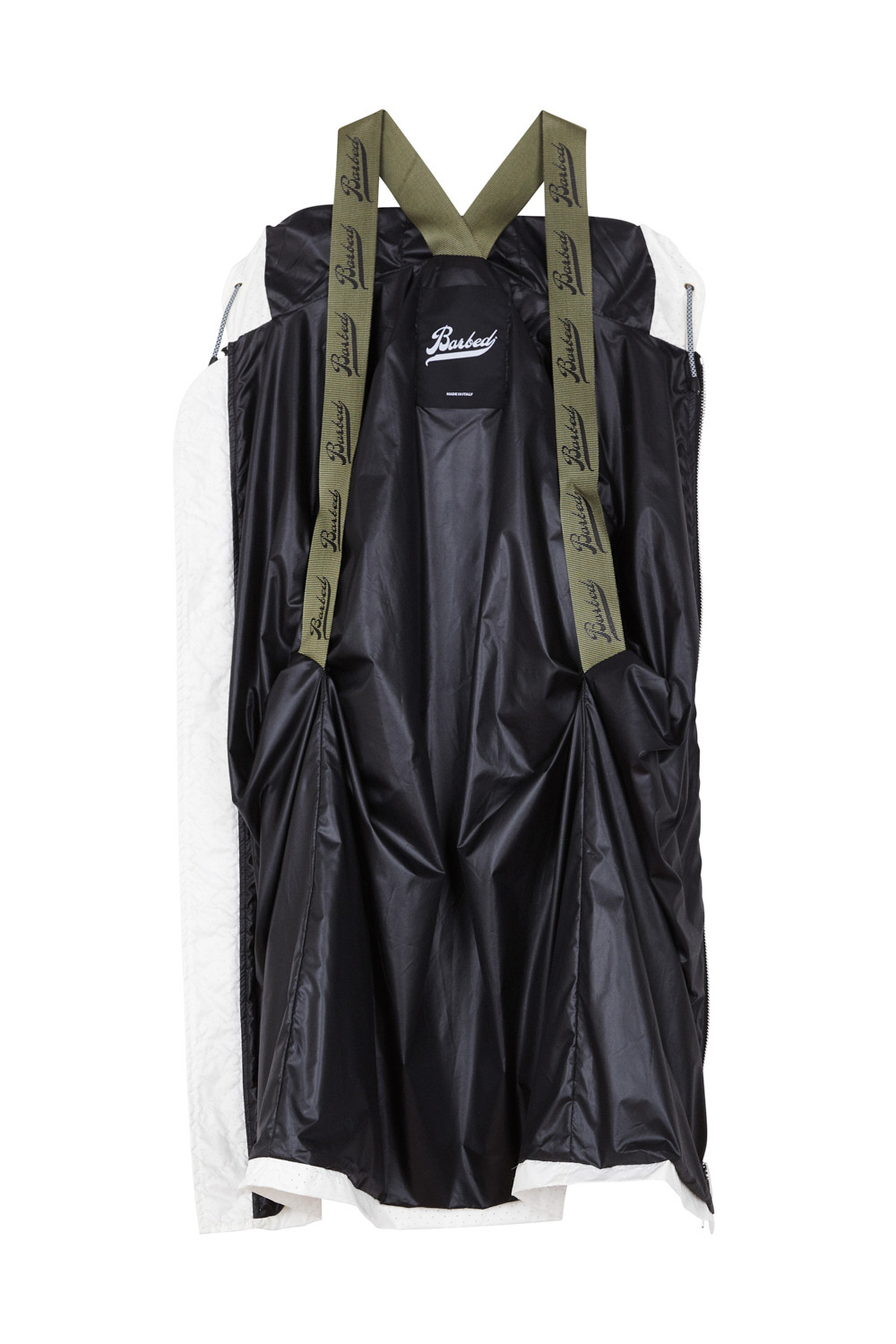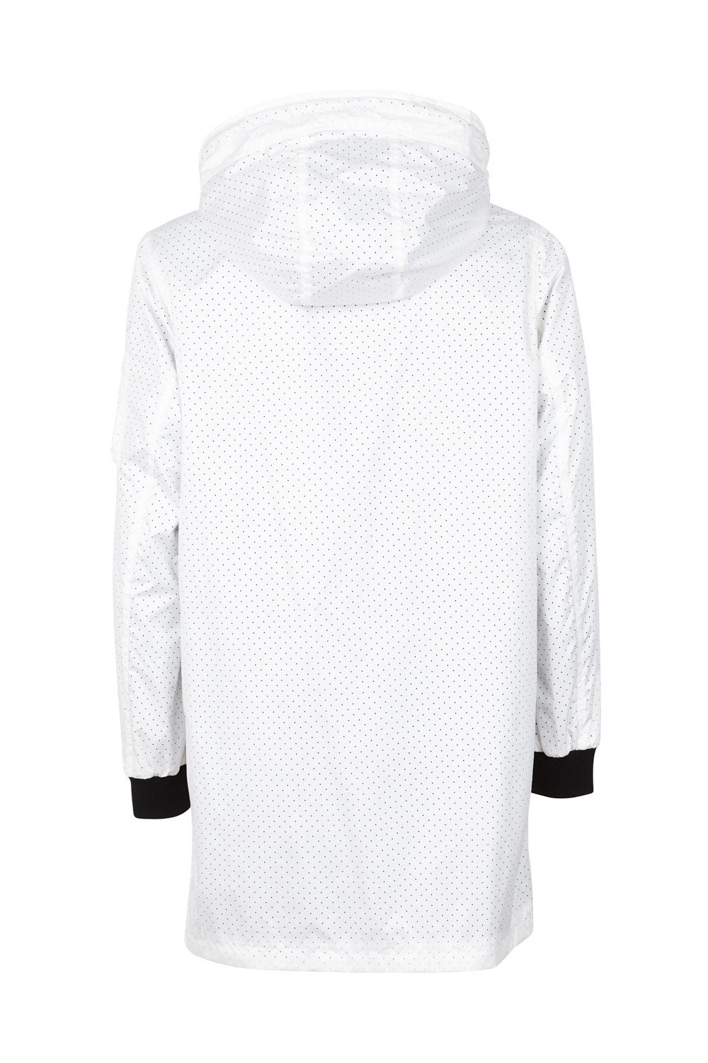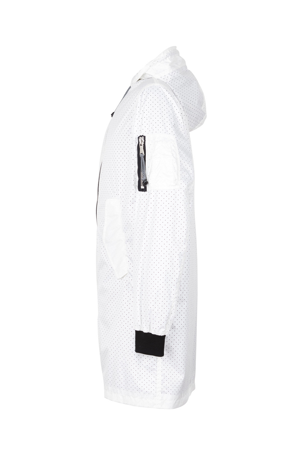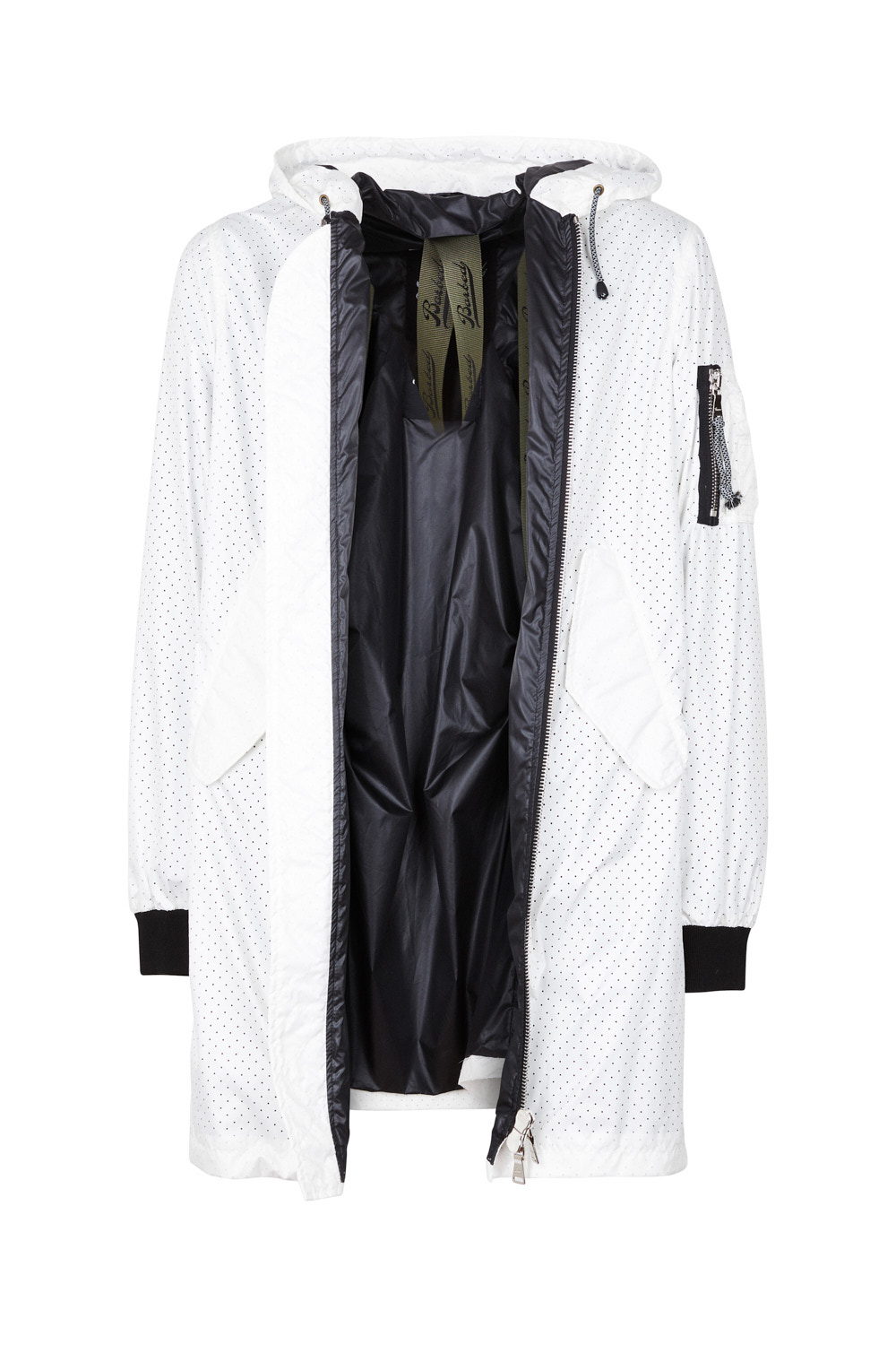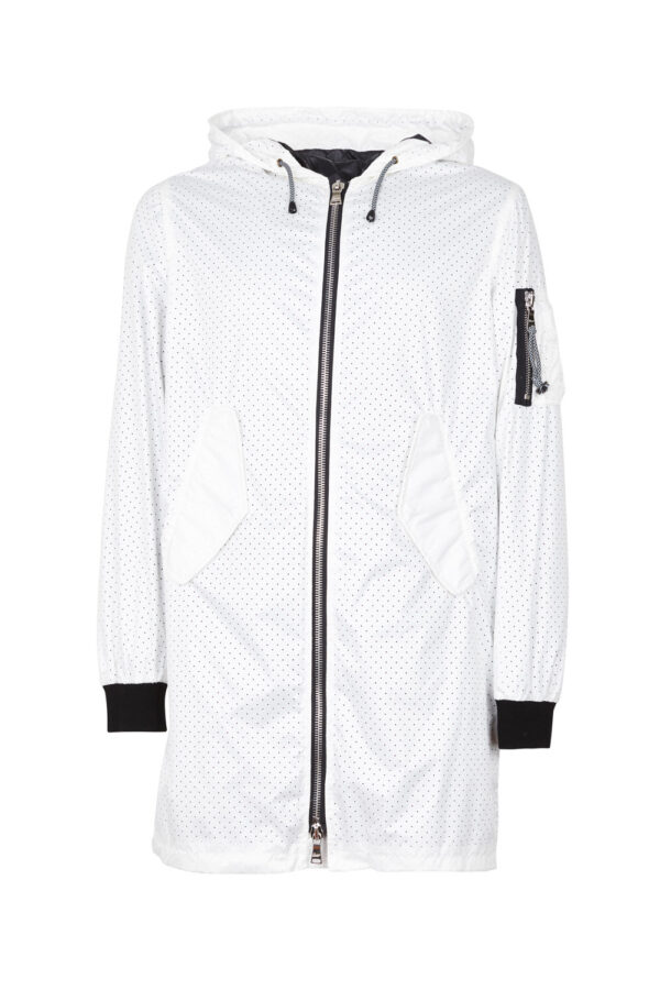 Bomber Long with hood. Shell fabric 100% polyester, drilled, colour white. Inside lining in nylon, colour black. 2 flapped front pockets with snap buttons. Pocket on left sleeve with zip closure. Long sleeves with cuffs. Zip and press stud closure. Unisex.