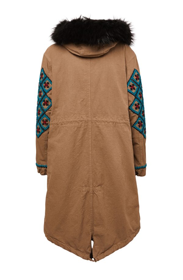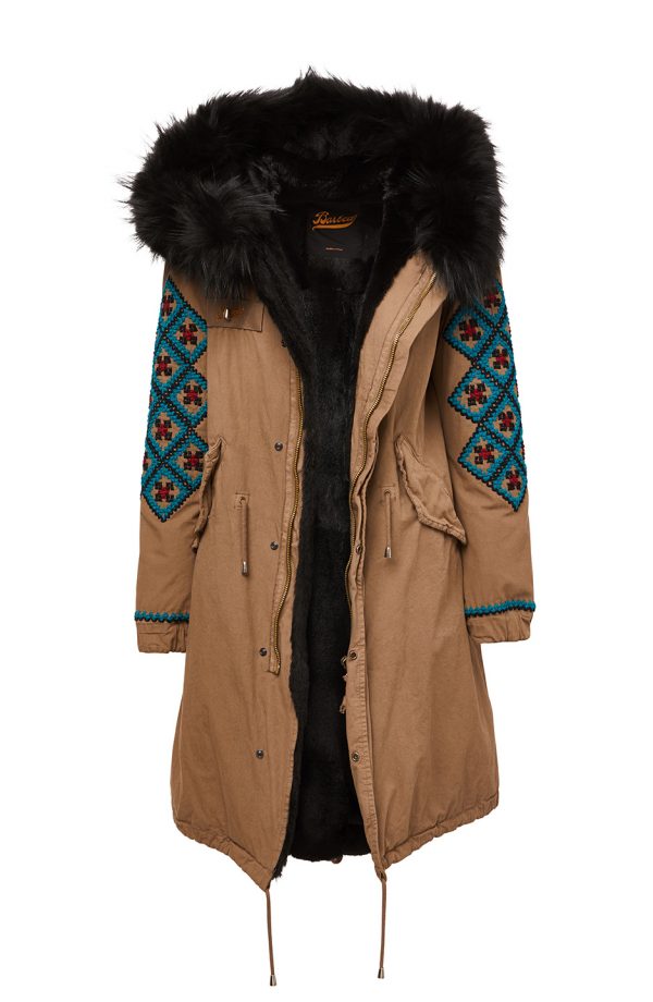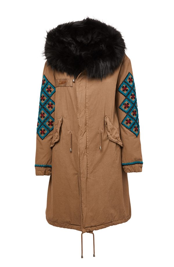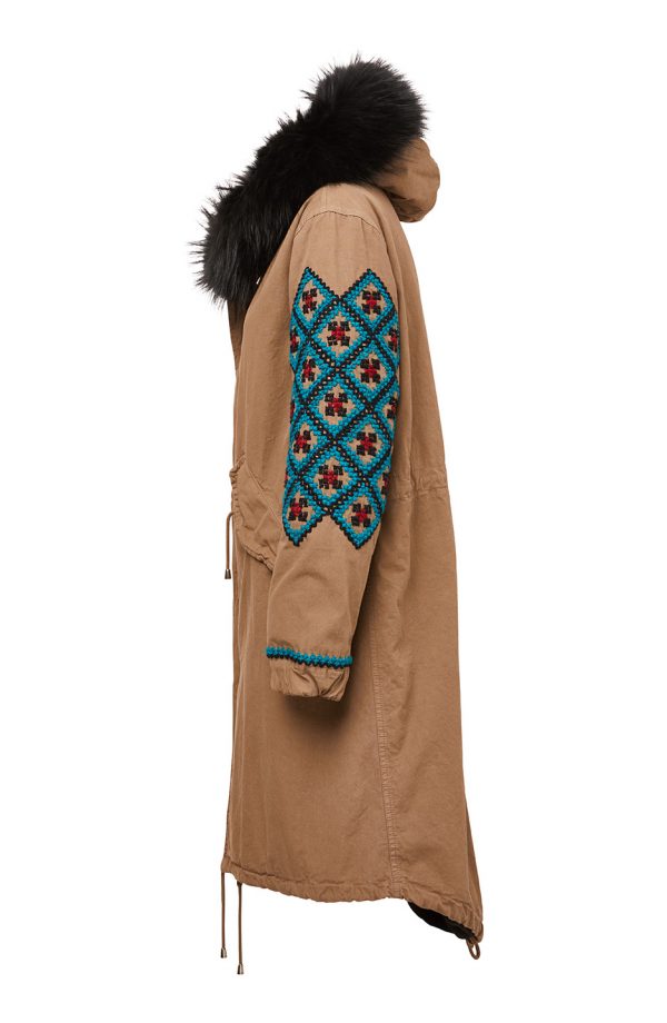 Women’s long drake parka. Shell fabric 100% cotton, dove gray color, handmade geometric embroidery. Black shaved lapin fur (rabbit). Black feenracoon fur hood edge. Long sleeve, padded quilted inner sleeve. 2 front pockets with flap, snap button closure. Zip and press-stud closure. Drawstring waist, hood and bottom parkas.