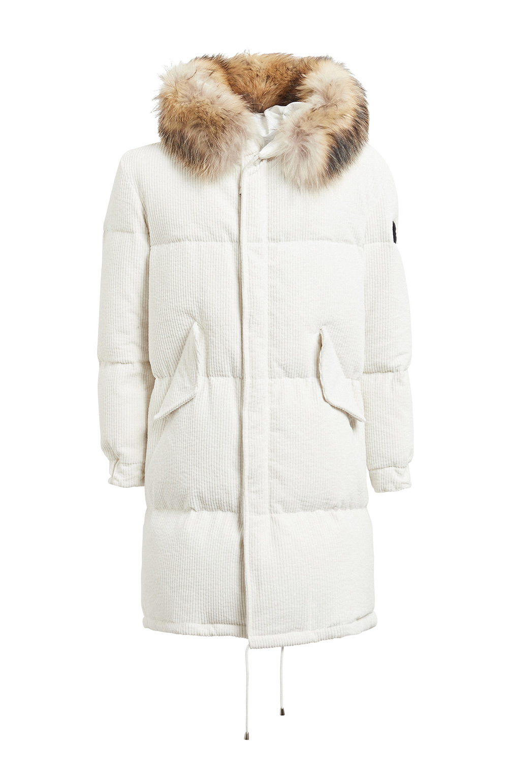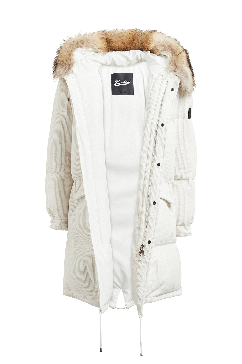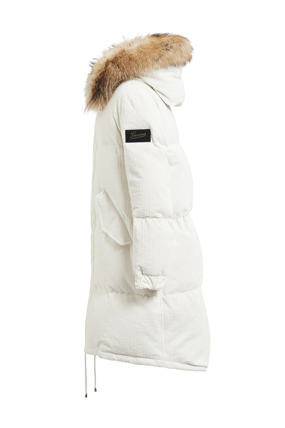 Parka Drake Long Woman. Shell fabric in corduroy (velvet), colour white. Inside lining all goose feather 80/20 class 3 standard europe – 150 gr with covering 100% polyester, colour white. Removable border hood in natural finn racoon fur. Long sleeve all goose and button fastening cuffs. 2 flapped front pockets with snap buttons. Drawstring adjustable in hood and bottom. Double slide zipper center front and press studs. Regular fit.