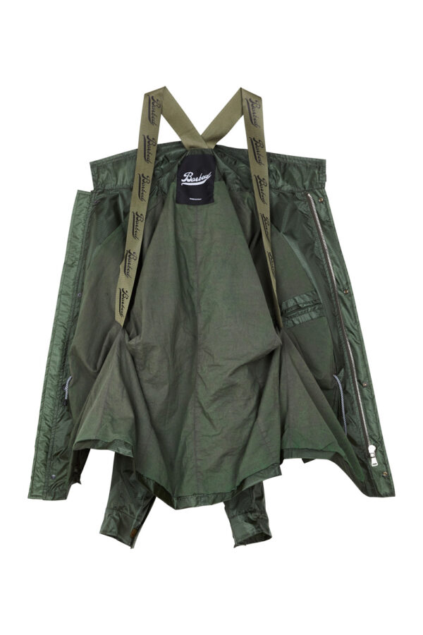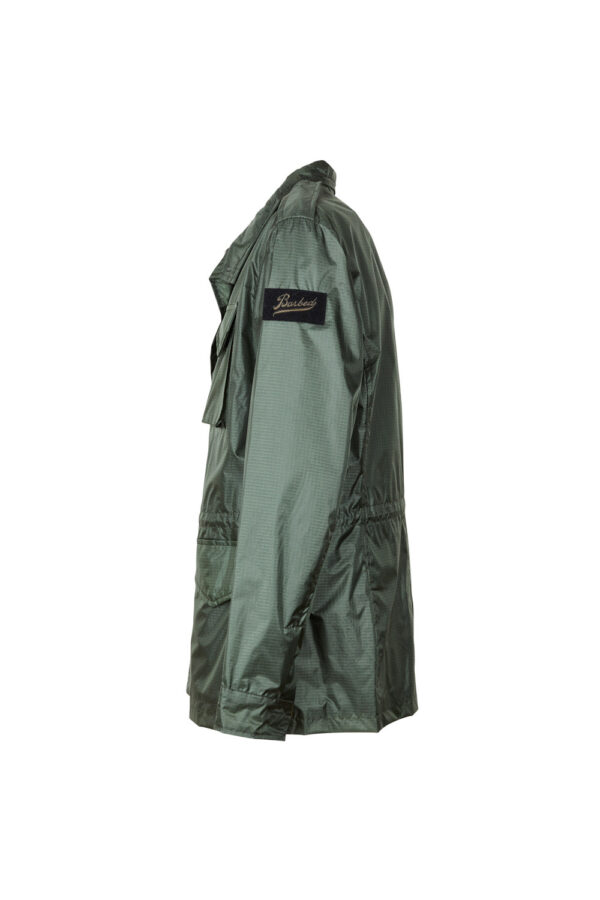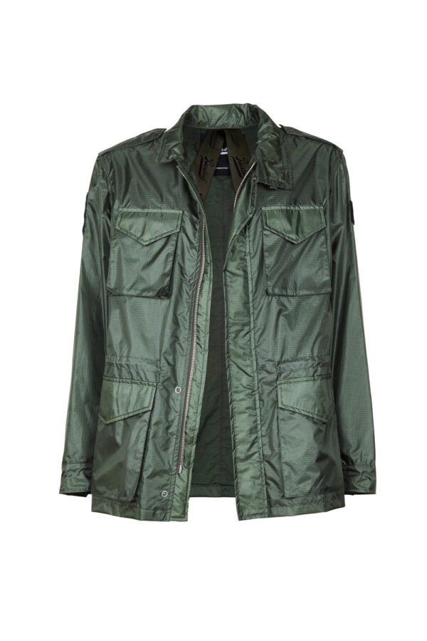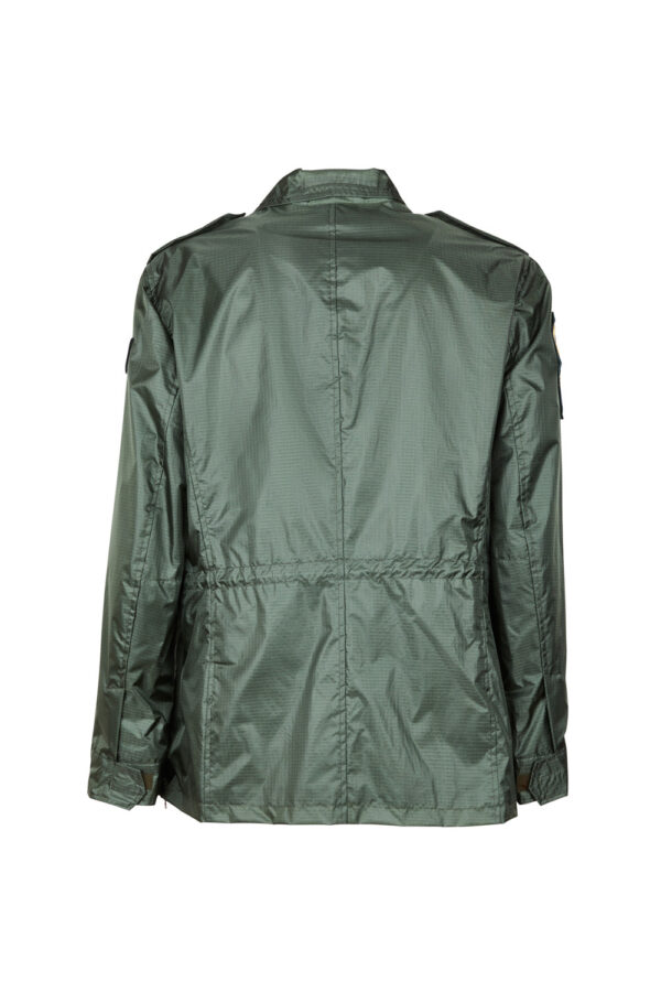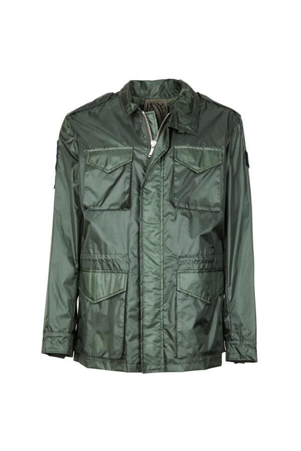 Field Jacket Man. Shell fabric 100% nylon ripstop, colour green. Inside lining in 100% cotton. Inside lining with logo braces. 4 flapped front pockets with clip buttons. Drawstring adjustable in waist. Zipper center front and press studs.