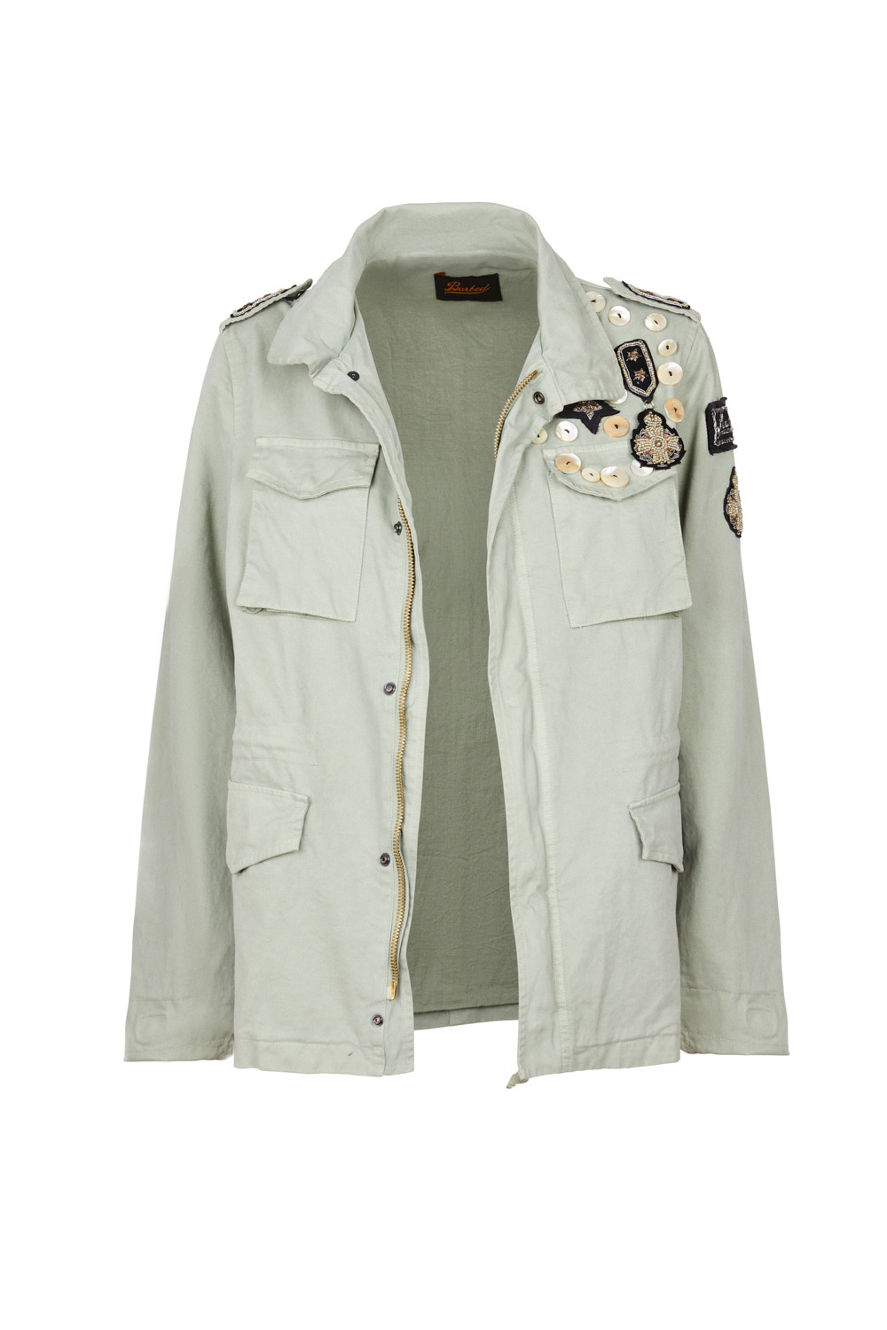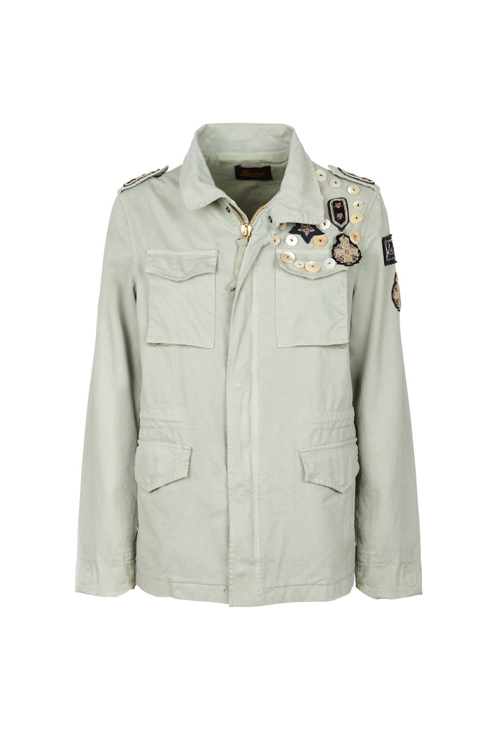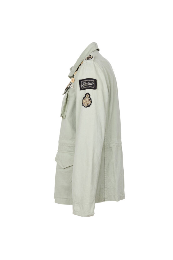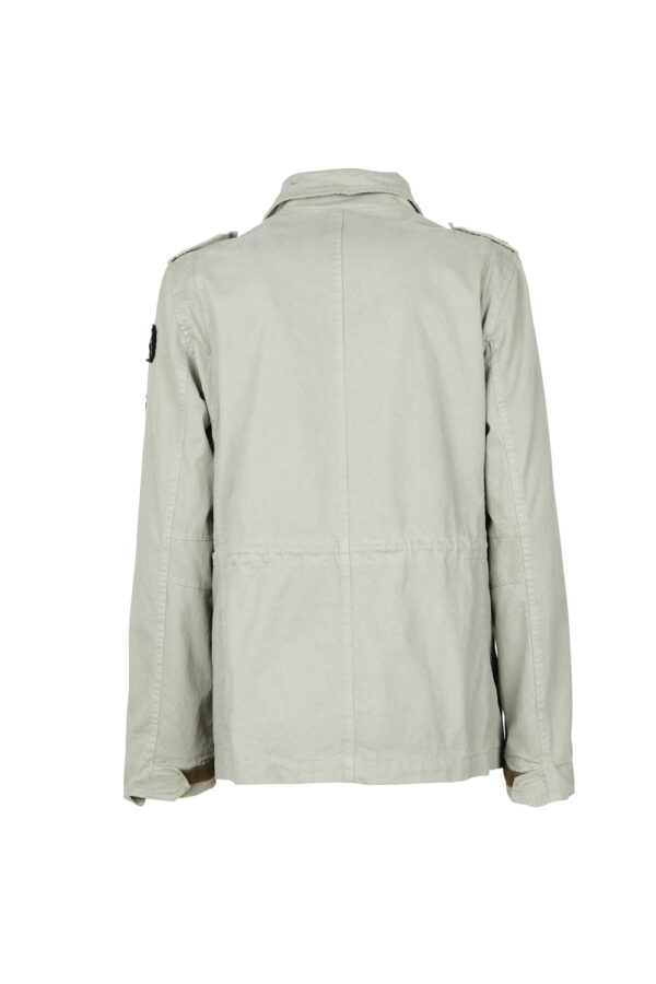 Field Jacket woman. Shell fabric 97% cotton, 3% elastan, colour salvia. Inside lining in 100% cotton, colour salvia. Multipatch and buttons on breast and left sleeve. 4 flapped front pockets with clip buttons. Drawstring adjustable in waist. Zipper center front and press studs.