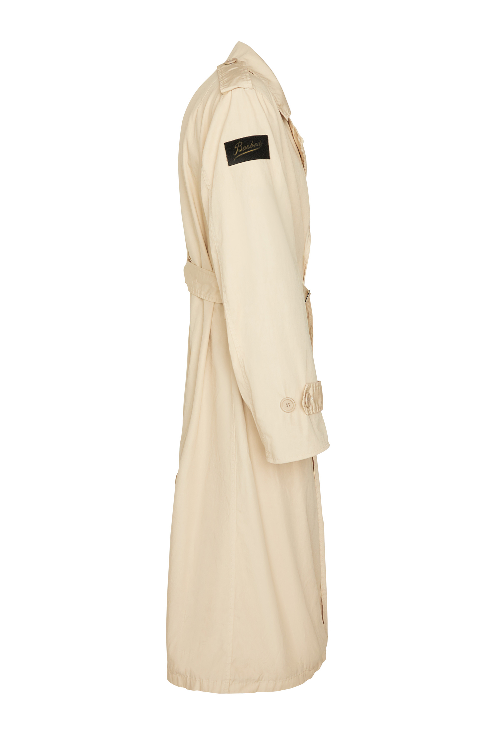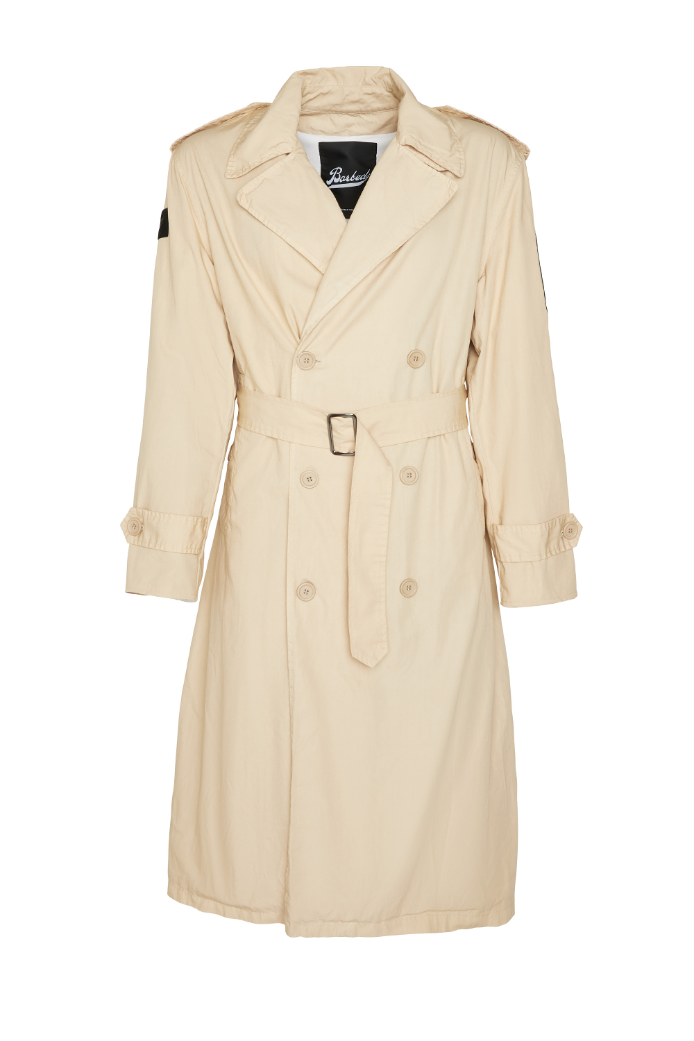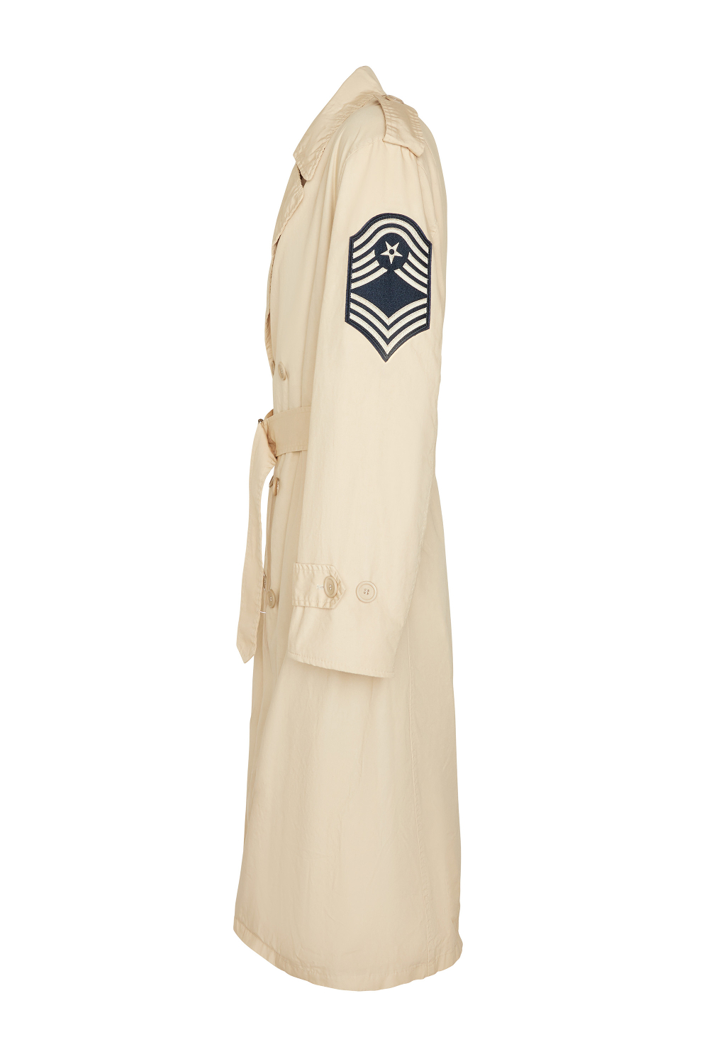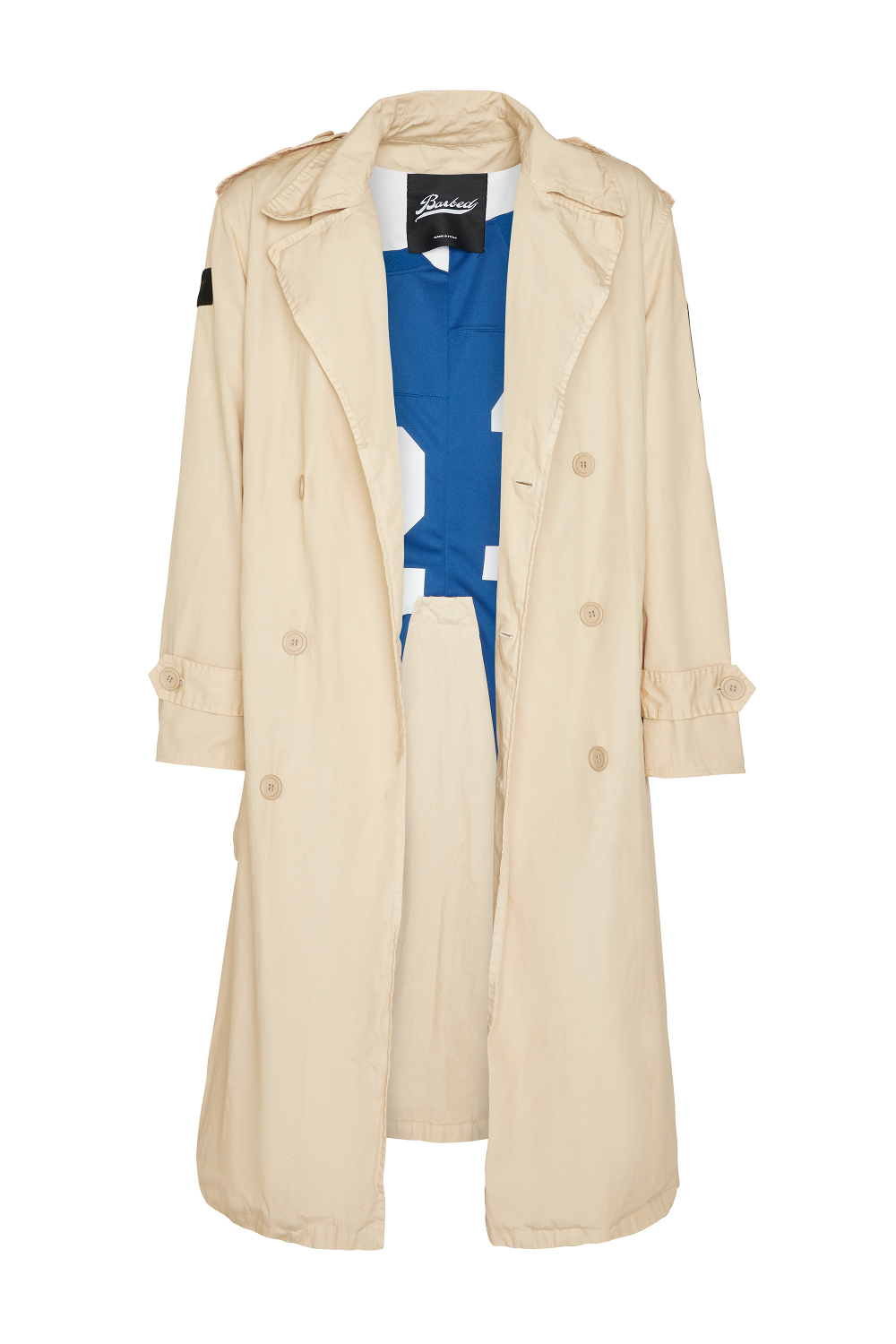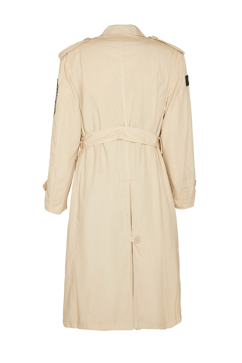 Impermeabile unisex. Shell fabric 100% cotton, colour beige. Inside lining made of a patchwork of sport vintage t-shirts. Big military patch with 3 levels and a star (colour beige on blue background) on left sleeve. 2 front pockets with buttons. Closure with buttons and belt. Oversize fit, unisex.