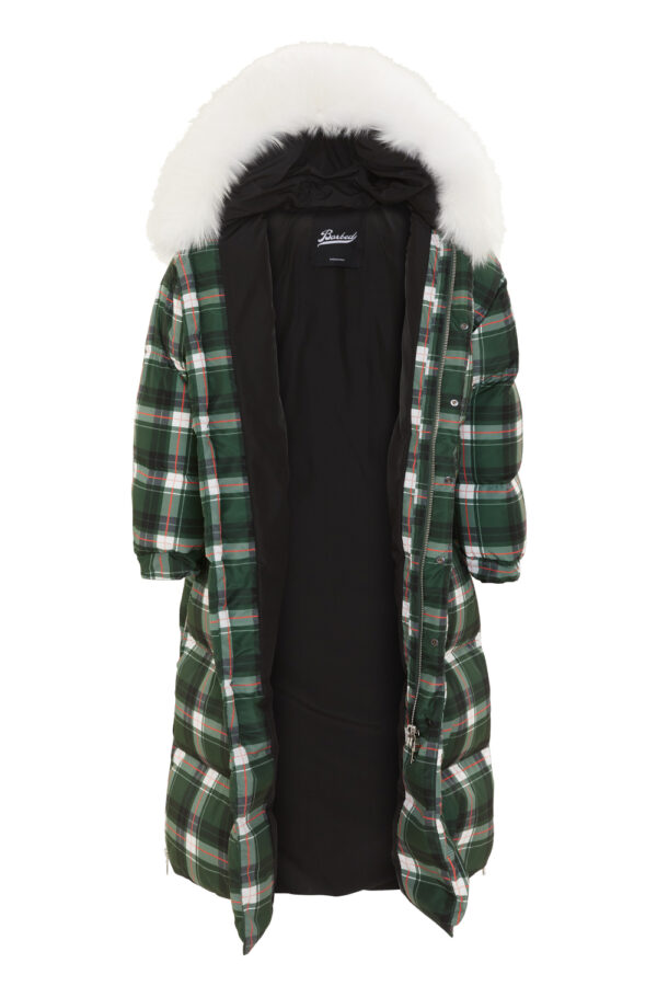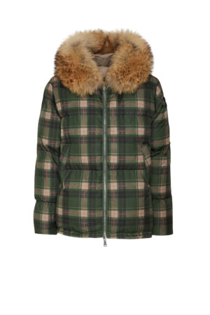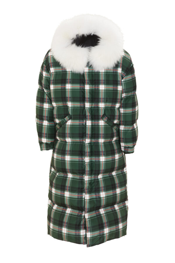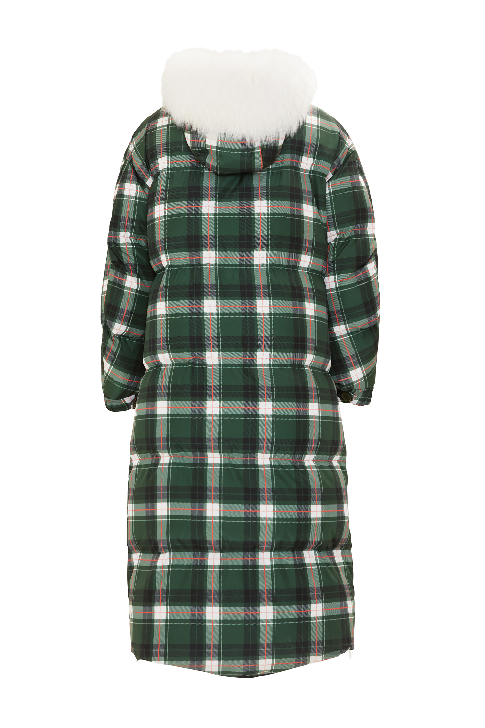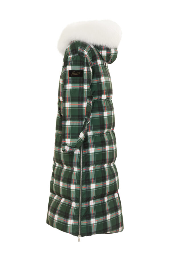 M72 extra long style, all goose and unisex. Shell external fabric in 100% polyester, check print colour latte. Inside lining all goose feather 80/20 class 3 standard europe with fabric covering in 100% polyester, colour black and long all goose sleeves. Drawstring adjustable in hood and removable border hood in finn racoon white. 2 flapped front pockets with snap buttons and 2 lateral zips at the bottom. Double slide zipper center front and press studs. Oversize fit.