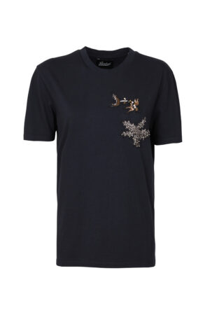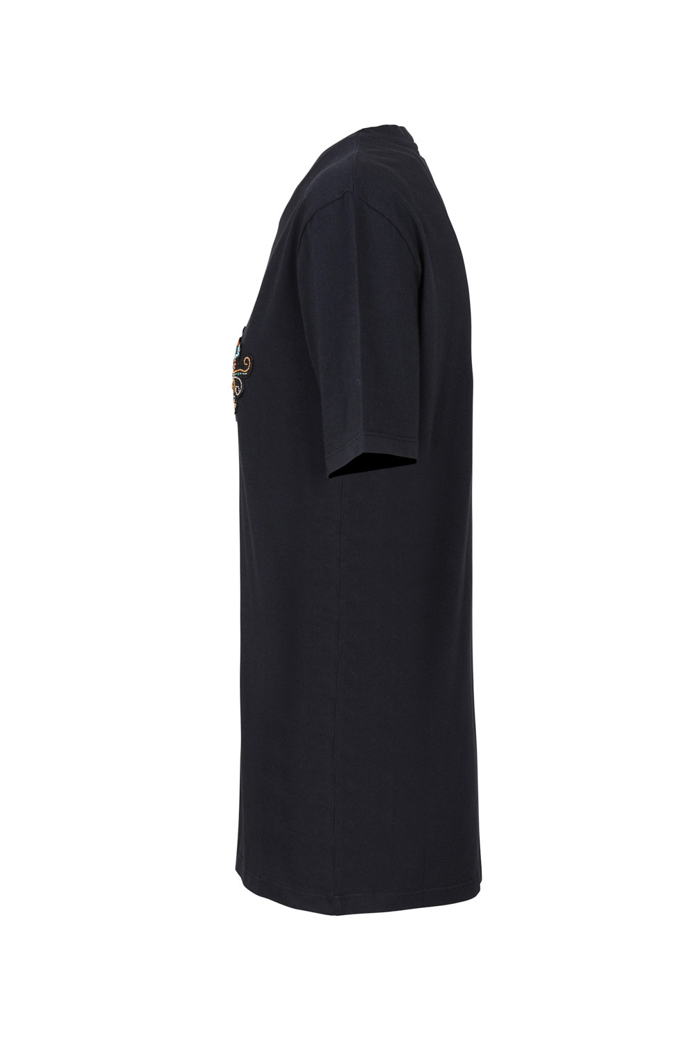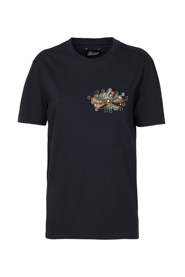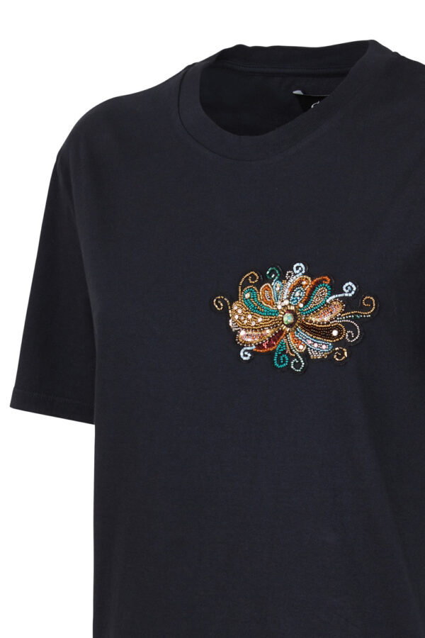 T-shirt unisex, with round neck and short sleeves. Fabric 100% cotton, colour black. Flower multicolor patch on the front.